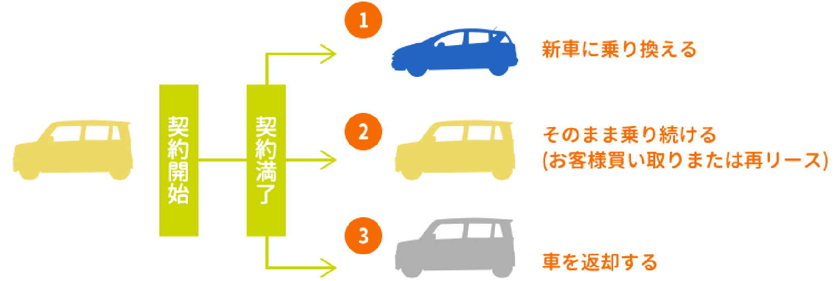 暮らしの変化に合わせて、乗り換えていく車。あなたとご家族に合わせて、乗換時期も3年、5年、7年と選べる「スーパー乗るだけセット®」契約終了後は次の3つがあります。